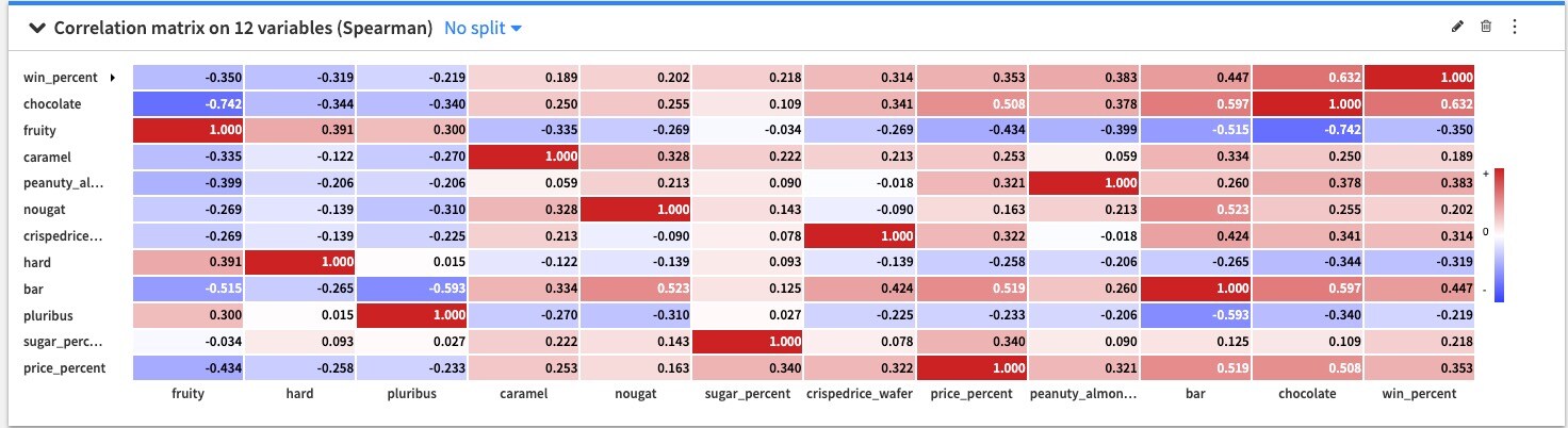 To help solve this problem, the idea of correlation and a correlation matrix was presented. By creating a correlation matrix, it would be possible to see the strength of each attribute in relation to the winning percent. As shown in the following correlation matrix, the students found that “fruity” and “hard” candies have a negative correlation with winning, whereas “chocolate” and “bar” have a very strong positive correlation. In many cases, this helped the students validate their assumptions - and in other cases, provided interesting insight.