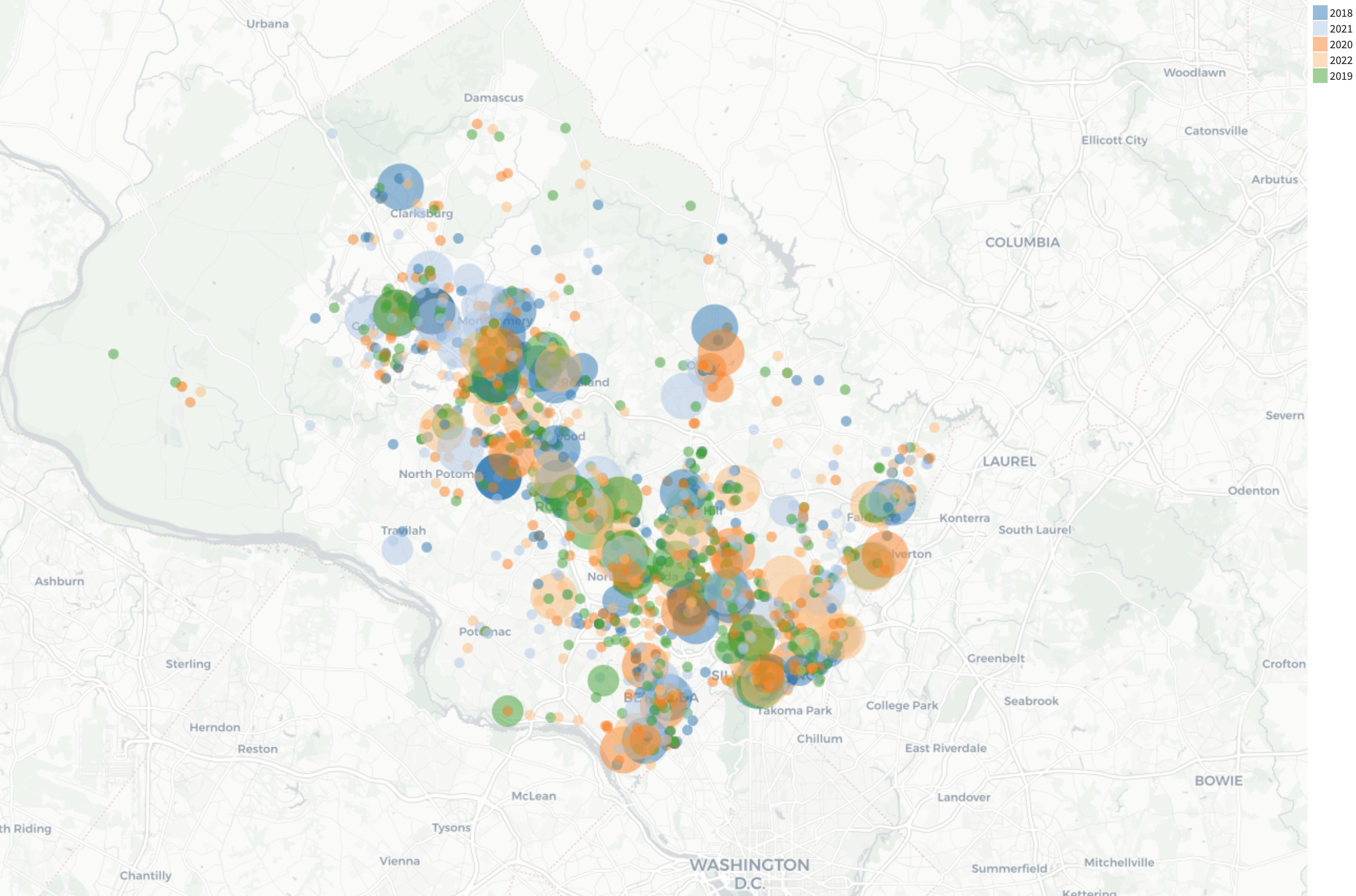 Another interesting observation is that the number of incidents related to pedestrians being struck by a vehicle appears to trend upward in spring, presumably when weather conditions are better for venturing outdoors. We notice a drop in July and September, with a spike in November. We could look further to see if there are local fall festivals or Thanksgiving travel (the most traveled holiday in the country) that could be contributing to the data we are seeing. The Dataiku scatter map below of Montgomery County, MD, represents traffic-related incidents (blue dots) and pedestrians stuck by a vehicle in 2022 (red dots).